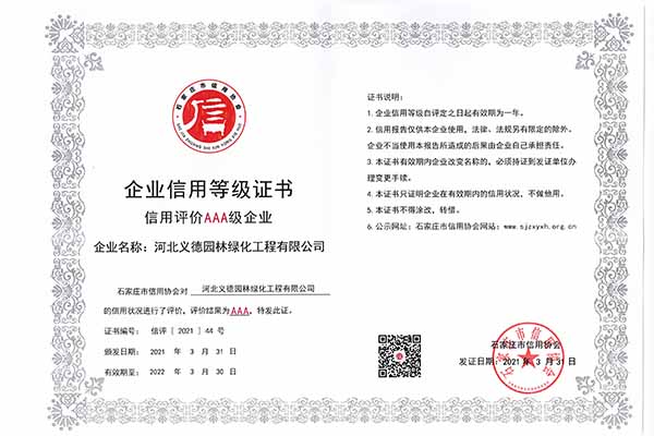 近幾年來我公司被授予2019年-2022年河北省扶貧龍頭企業(yè)、2018年國家林業(yè)標準化示范企業(yè)、2019年度全國苗圃50強、2018-2019年度河北省林業(yè)重點龍頭企業(yè)、2018年保定市精品特色現(xiàn)代農(nóng)業(yè)園區(qū)、2018年度保定林木種苗協(xié)會授予特色苗圃、2018年度北方十佳特色苗圃、2016-2019年河北省建設(shè)工程招標投標誠實守信5A級施工企業(yè)等榮譽稱號,2017年保定市林木種苗龍頭企業(yè)、石家莊市2017年度優(yōu)秀園林企業(yè)。